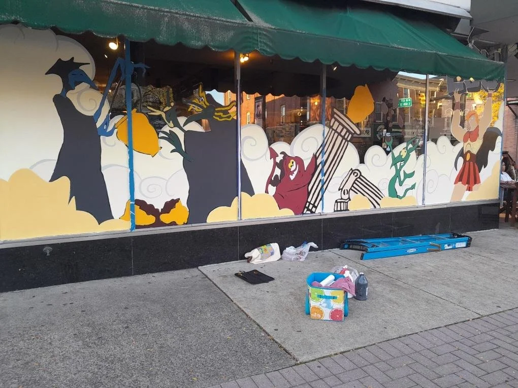Foe this project I collaborated with my fellow student, Katrina McDevitt, to create a continuous 5-window, full-scale scene depicting characters from Disney’s Hercules. The Homecoming theme for 2023 was ‘Super Hero’, and we wanted to bring in the theme of wine since our collaborating business was The Renegade Winery. Disney’s Hercules seemed like the perfect fit due to the Greek setting in which is known to involve wine.